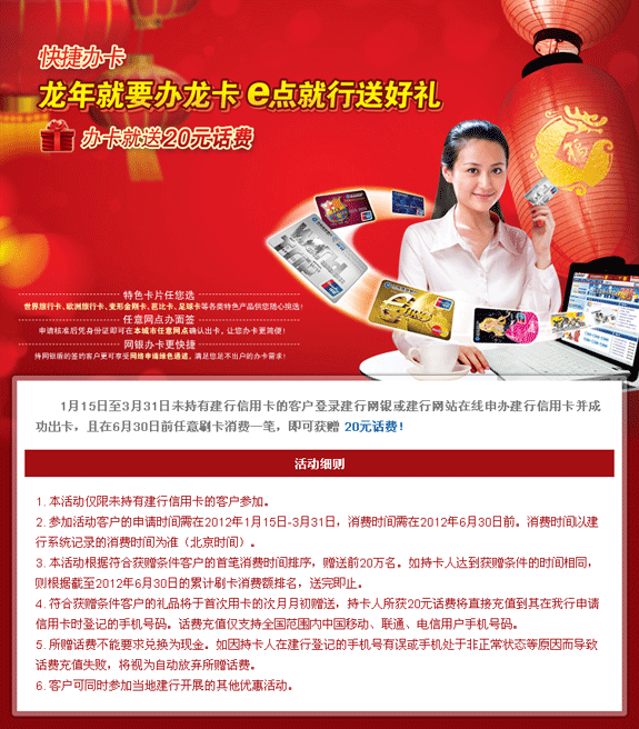 “龙年就要办龙卡,e点就行送好礼”----办卡就送20元话费!