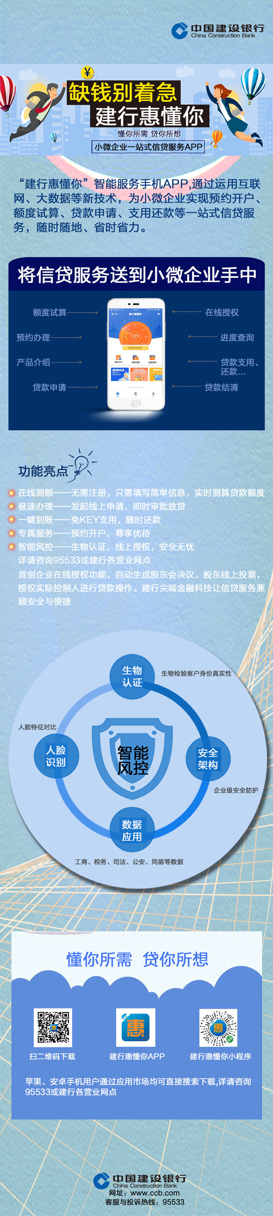 建设银行基于交易结算、纳税记录等大数据信息评估企业信用,全程在线为小微企业提供一站式信贷服务,您可通过“惠懂你”APP直接办理在线测额、预约开户、开户、申贷、签约、支用及还款等多种业务,无担保、无抵押,最高可获300万元信用额度贷款!懂你所需,贷你所想,建行惠懂你,邀您扫码来体验!