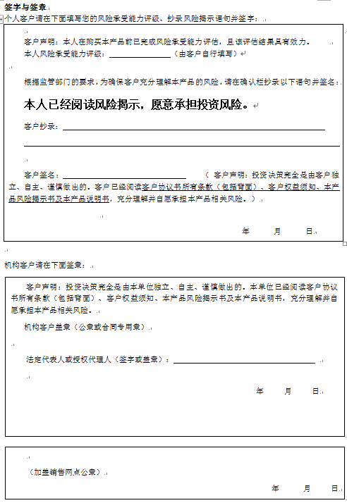您签署本风险揭示书、客户协议书,并将资金委托给中国建设银行重庆市分行运作是您真实的意思表示。本风险揭示书及相应的客户协议书、产品说明书、客户权益须知将共同构成贵我双方理财合同的有效组成部分。