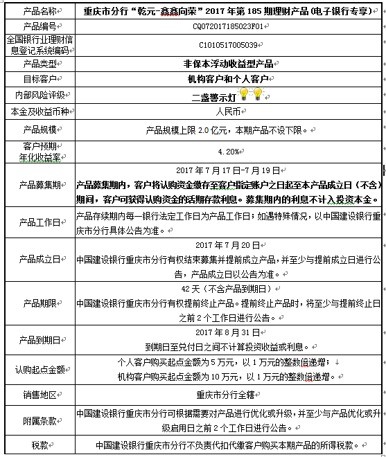 中国建设银行重庆市分行“乾元-鑫鑫向荣” 2017年第185期理财产品风险揭示书和产品说明书