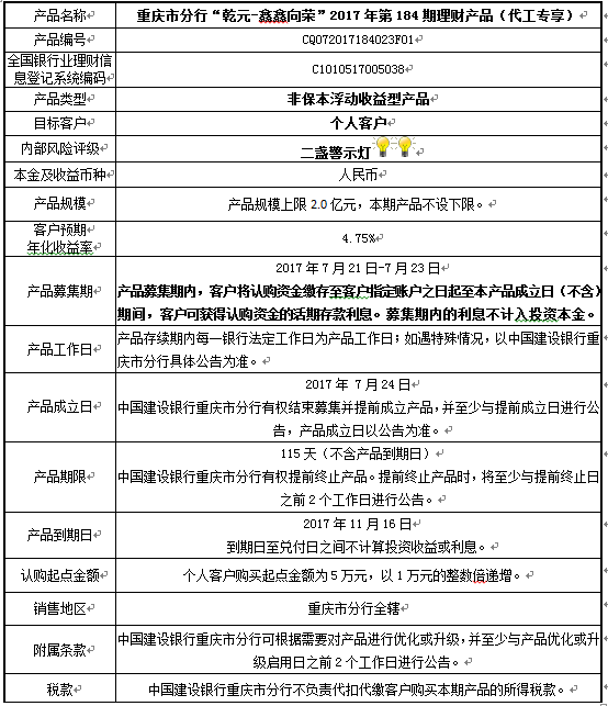 本产品为非保本浮动收益型理财产品,不保证本金和收益,请您充分认识投资风险,谨慎投资。本期产品期限为115天(中国建设银行有权对产品进行展期或提前终止),存续期内,产品不接受申购或赎回申请。本期产品内部风险评级级别为二盏警示灯,风险水平属于较低风险。最不利情况下,您将损失全部收益甚至包括全部本金。本理财产品适用于收益型、稳健型、进取型 、积极进取型客户。