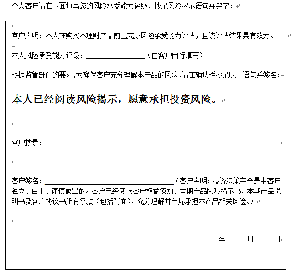 在您签署《中国建设银行股份有限公司理财产品客户协议书》前,应当仔细阅读客户权益须知、本风险揭示书及本产品的产品说明书的全部内容,同时向中国建设银行了解本产品的其他相关信息,并自己独立做出是否认(申)购本产品的决定。
