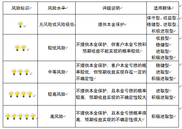 ,风险水平属于较低风险。最不利情况下,您将损失全部收益甚至包括全部本金。本理财产品适用于稳健型、进取型 、积极进取型客户。