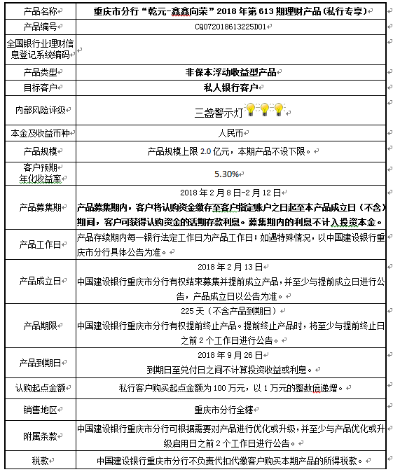 本产品为非保本浮动收益型理财产品,不保证本金和收益,请您充分认识投资风险,谨慎投资。本期产品期限为225天(中国建设银行有权对产品进行展期或提前终止),存续期内,产品不接受申购或赎回申请。本期产品内部风险评级级别为三盏警示灯