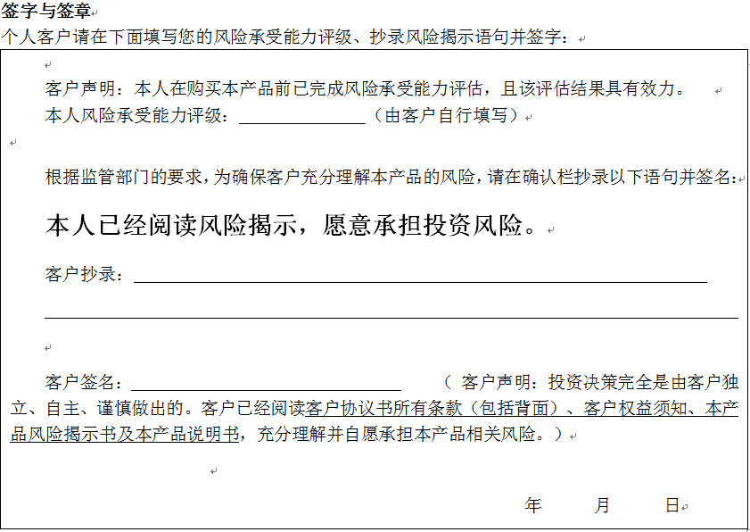 您在签署《中国建设银行股份有限公司理财产品客户协议书》前,应当仔细阅读客户权益须知、本风险揭示书及本产品的产品说明书的全部内容,同时向中国建设银行重庆市分行了解本产品的其他相关信息,并自己独立做出是否购买本产品的决定。