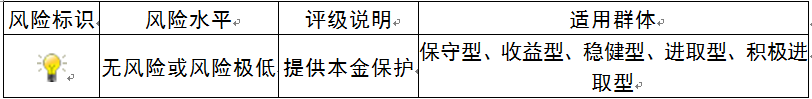 ,风险程度属于无风险或风险极低,适用于保守型、收益型、稳健型、进取型及积极进取型投资者。最不利情况下,客户只能收回投资本金,不能获得任何投资收益。