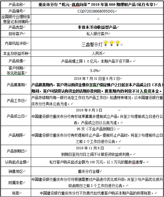 1.本期产品规模上限:1.0亿元。在本期产品募集期内,对本期产品的认购金额达到本期理财产品规模上限,则中国建设银行重庆市分行有权利但无义务停止本期产品的认购,已经认购成功的客户投资权益不受影响。