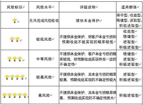 本产品为非保本浮动收益型理财产品,不保证本金和收益,请您充分认识投资风险,谨慎投资。本期产品期限为105天(中国建设银行有权对产品进行展期或提前终止),存续期内,产品不接受申购或赎回申请。本期产品内部风险评级级别为三盏警示灯 ,风险水平属于中等风险。最不利情况下,您将损失全部收益甚至包括全部本金。本理财产品适用于稳健型、进取型 、积极进取型客户。