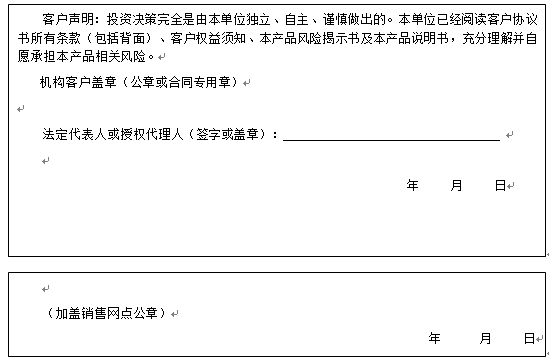 客户签名: ( 客户声明:投资决策完全是由客户独立、自主、谨慎做出的。客户已经阅读客户协议书所有条款(包括背面)、客户权益须知、本产品风险揭示书及本产品说明书,充分理解并自愿承担本产品相关风险。)