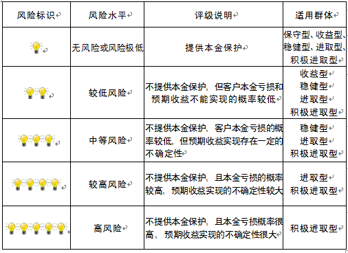 本产品为非保本浮动收益型理财产品,不保证本金和收益,请您充分认识投资风险,谨慎投资。本期产品期限为97天(中国建设银行有权对产品进行展期或提前终止),存续期内,产品不接受申购或赎回申请。本期产品内部风险评级级别为三盏警示灯,风险水平属于中等风险。最不利情况下,您将损失全部收益甚至包括全部本金。本理财产品适用于稳健型、进取型 、积极进取型客户。