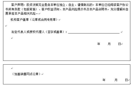 客户签名: ( 客户声明:投资决策完全是由客户独立、自主、谨慎做出的。客户已经阅读客户协议书所有条款(包括背面)、客户权益须知、本产品风险揭示书及本产品说明书,充分理解并自愿承担本产品相关风险。)