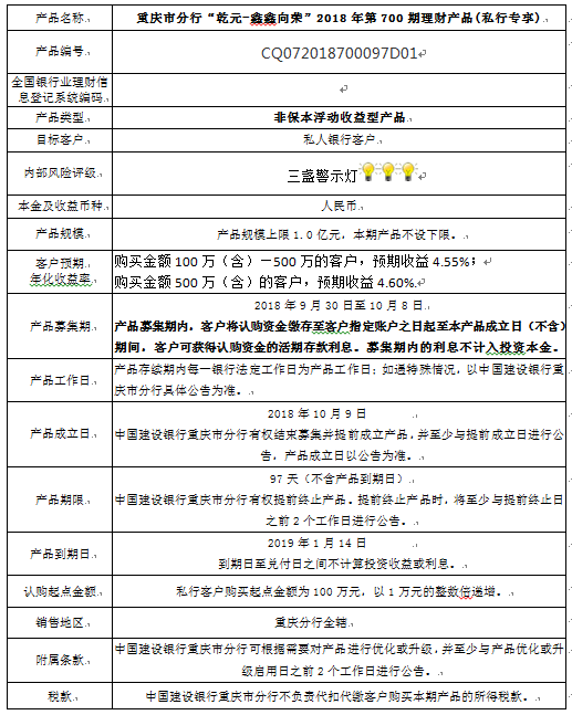 3.中国建设银行重庆市分行可根据市场情况等调整产品规模上、下限,并最迟于调整规模上下限当日进行公告。