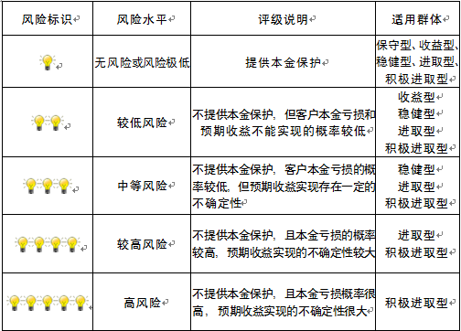 本产品为非保本浮动收益型理财产品,不保证本金和收益,请您充分认识投资风险,谨慎投资。本期产品期限为99天(中国建设银行有权对产品进行展期或提前终止),存续期内,产品不接受申购或赎回申请。本期产品内部风险评级级别为三盏警示灯,风险水平属于中等风险。最不利情况下,您将损失全部收益甚至包括全部本金。本理财产品适用于稳健型、进取型 、积极进取型客户。