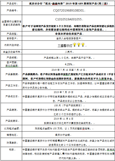 1.本期产品规模上限:1.0亿元。在本期产品募集期内,对本期产品的认购金额达到本期理财产品规模上限,则中国建设银行重庆市分行有权利但无义务停止本期产品的认购,已经认购成功的客户投资权益不受影响。