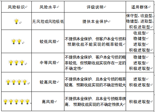 本产品为非保本浮动收益型理财产品,不保证本金和收益,请您充分认识投资风险,谨慎投资。本期产品期限为275天(中国建设银行有权对产品进行展期或提前终止),存续期内,产品不接受申购或赎回申请。本期产品内部风险评级级别为三盏警示灯 ,风险水平属于中等风险。最不利情况下,您将损失全部收益甚至包括全部本金。本理财产品适用于稳健型、进取型 、积极进取型客户。