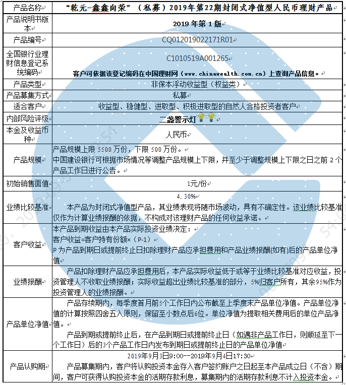 本产品为封闭式净值型理财产品,不保证本金和收益,请您充分认识投资风险,谨慎投资。本产品任何业绩比较基准、测算收益或类似表述均属不具有法律约束力的用语,不代表客户可能获得的实际收益,亦不构成中国建设银行重庆市分行对本产品的任何收益承诺。产品期限为固定期限(中国建设银行重庆市分行有权提前终止产品),存续期内产品不接受赎回申请。 本期产品内部风险评级级别为二盏警示灯 ,风险程度属于较低风险,适用于收益型、稳健型、进取型和积极进取型客户。最不利情况下,本期产品投资的资产无法回收任何本金和净收益,客户将损失全部本金。投资者不得使用贷款、发行债券等筹集的非自有资金投资本产品。如影响您风险承受能力的因素发生变化,请及时完成风险承受能力评估。