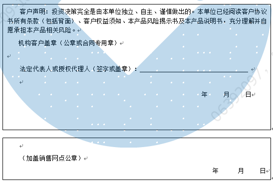 客户签名: ( 客户声明:投资决策完全是由客户独立、自主、谨慎做出的。客户已经阅读客户协议书所有条款(包括背面)、客户权益须知、本产品风险揭示书及本产品说明书,充分理解并自愿承担本产品相关风险。)