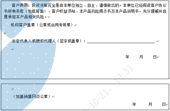 客户签名: ( 客户声明:投资决策完全是由客户独立、自主、谨慎做出的。客户已经阅读客户协议书所有条款(包括背面)、客户权益须知、本产品风险揭示书及本产品说明书,充分理解并自愿承担本产品相关风险。)