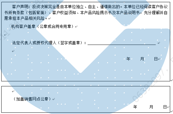 客户签名: ( 客户声明:投资决策完全是由客户独立、自主、谨慎做出的。客户已经阅读客户协议书所有条款(包括背面)、客户权益须知、本产品风险揭示书及本产品说明书,充分理解并自愿承担本产品相关风险。)