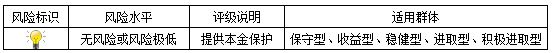 本期产品为保本浮动收益型理财产品,本理财产品有投资风险,只保障理财资金本金,不保证理财收益,您应当充分认识投资风险,谨慎投资。本期产品期限为41天(中国建设银行有权对产品进行展期或提前终止)。本期产品内部风险评级级别为一盏警示灯,风险程度属于无风险或风险极低,适用于保守型、收益型、稳健型、进取型及积极进取型投资者。最不利情况下,客户只能收回投资本金,不能获得任何投资收益。