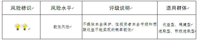 本期产品为非保本浮动收益型理财产品,不保证本金和收益,请您充分认识投资风险,谨慎投资。本期产品期限40(中国建设银行有权对本期产品进行展期和提前终止),存续期内产品不接受申购或赎回申请。本期产品内部风险评级级别为2盏警示灯 ,风险程度属于较低风险。最不利情况下,资产组合无法回收任何本金和净收益,客户将损失全部本金。产品适合于收益型、稳健型、进取型、积极进取型客户。