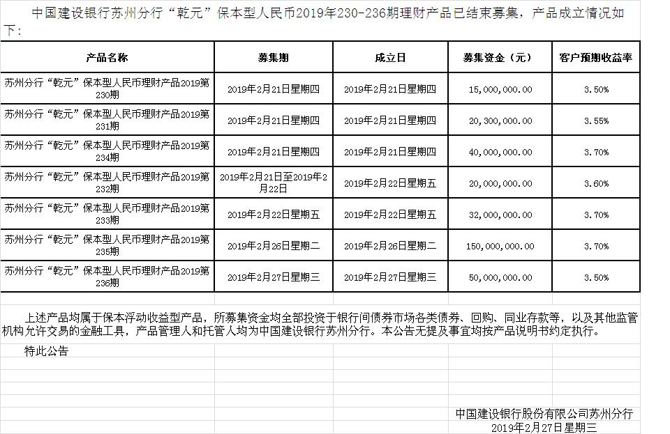 中国建设银行苏州分行“乾元”保本型人民币2019年230-236期理财产品成立公告